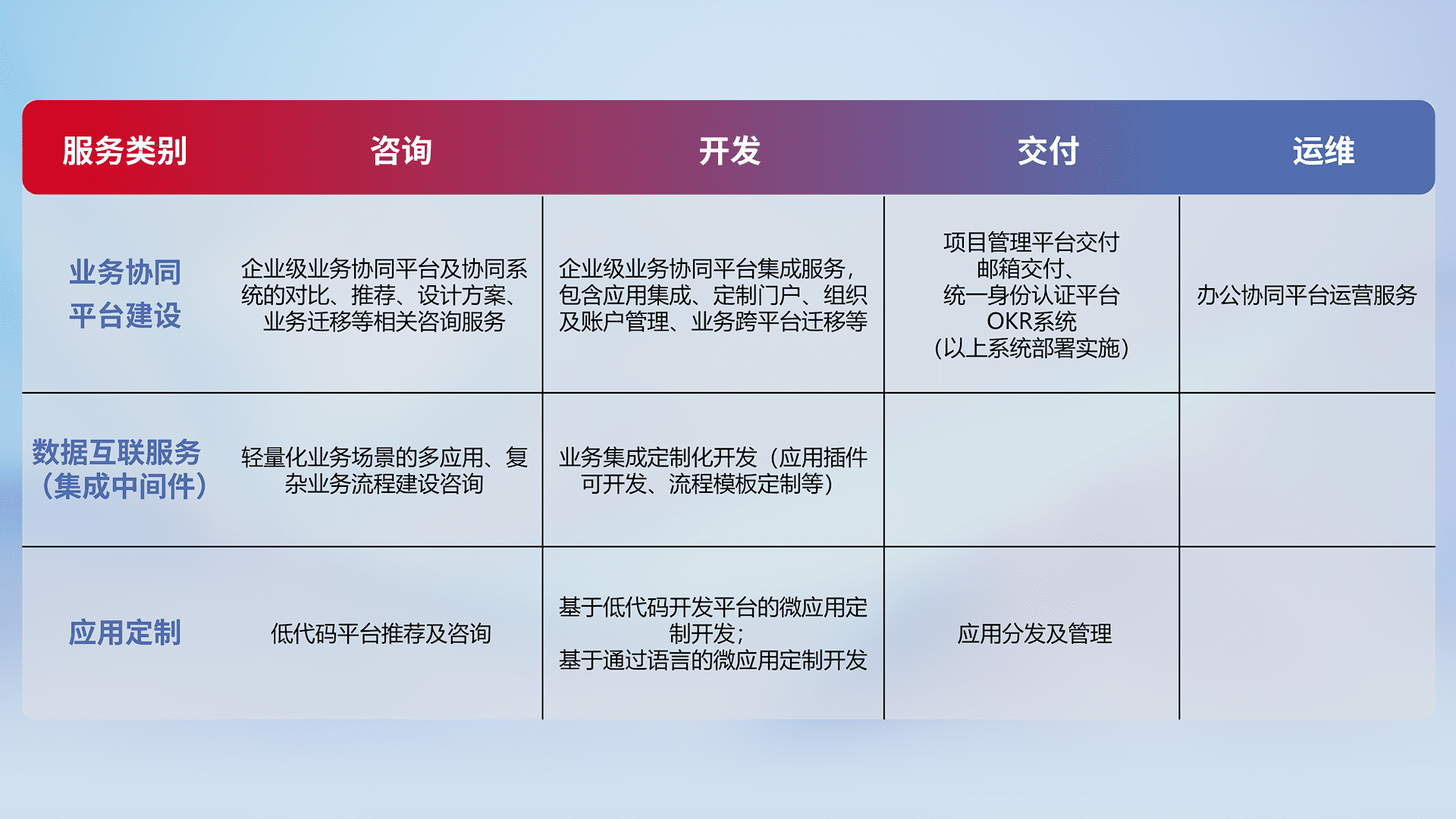 针对钉钉、、、、企微、、、、IDaas等平台级产品提供产品的规划、、、方案、、、交付、、、、定制化开发等服务,,,,实现如统一协同办公、、、智能客户服务、、、混合会议管理、、、、智能数据查询、、等业务场景,,,,实现数字化转型。。。。