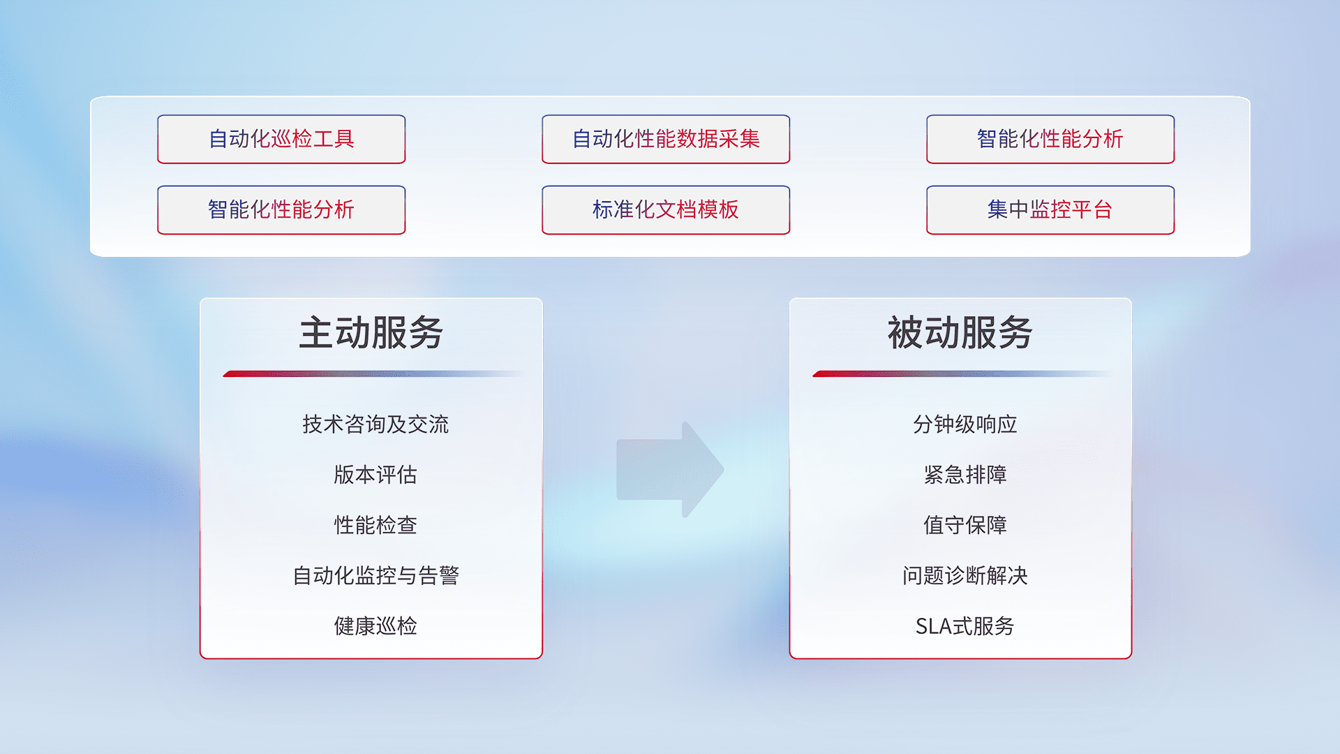 智能化工具和标准化文档,,保障服务质量,,提供主动服务(包含技术咨询、、、、版本评估、、、性能检查、、、、自动化监控与告警、、、、健康巡检)和被动服务包含(分钟级响应、、紧急排障、、、、值守保障、、、、问题诊断解决、、SLA服务)。。